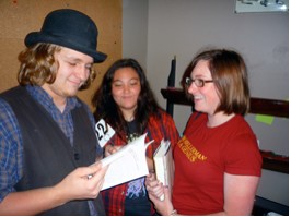 Kari and Kayla each read a passage from ANDROMEDA KLEIN, and so did my pal Jesse Michaels from the band Operation Ivy and Classics of Love. (That’s Greg, Kari, and Kayla in the photo, practicing before their readings.)