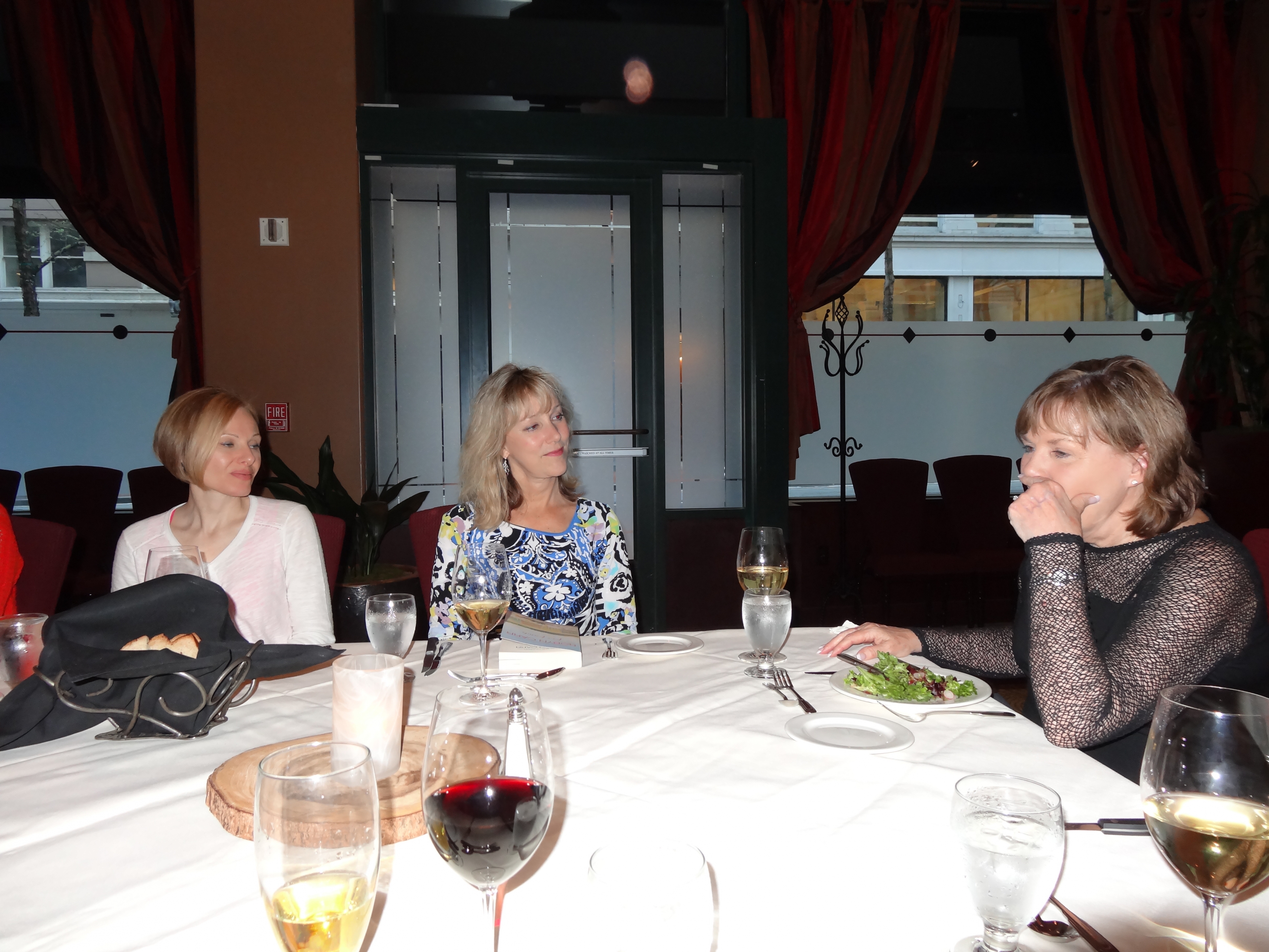 As the winners of the ReadingGroupGuides.com contest selected to have dinner with Robyn Carr and discuss her latest book, FOUR FRIENDS, The Spinebreakers book group had their monthly book club meeting last Friday evening at The Monaco Hotel in Portland, Oregon. Joining Robyn, who was a wonderful host for the discussion, was her daughter Jamie. FOUR FRIENDS touched on many different subjects, and it was difficult for the group to talk about them all while containing their excitement at having the author sitting across the table from them. They were trying their best not to cause Robyn to resort to taking a big dose of Dramamine as they were lobbing question after question at her from every side of the table and, heaven forbid, asking numerous questions all at the same time.