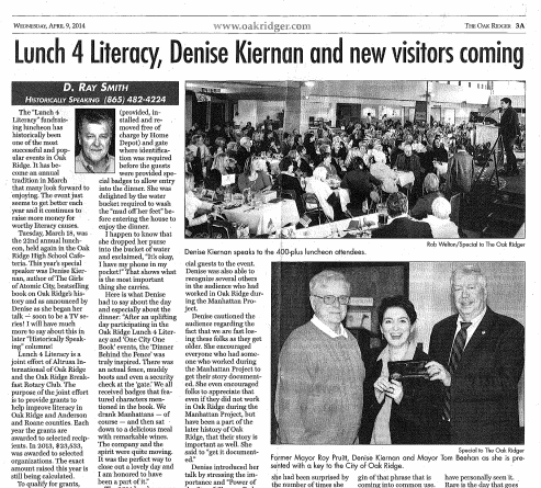 Anna Robinson: This is an annual event sponsored by the local Altrusa Club and the Oak Ridge Breakfast Rotary Club. It is always well attended. This year had the biggest crowd ever! I am sure it was because of the guest speaker, Denise Kiernan. As one of my friends said, "This is the social event of the year." She has a point because you do see people you haven't seen for months. Everyone dresses up and goes to enjoy a nice lunch and hear a great speaker. All this fun and for a very good cause. The money raised is used to promote literacy. Everyone deserves to know how t read and to have books available.