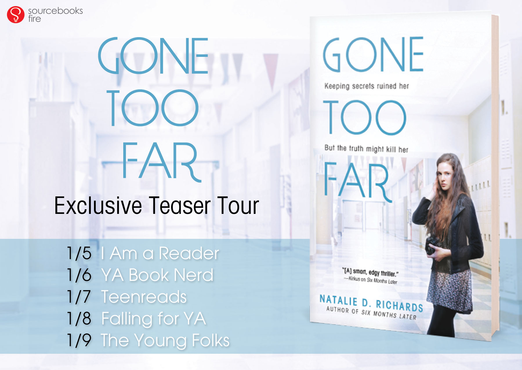 What would you do if you weren't the biggest fan of your classmates, and then a notebook bursting with scandalous secrets about them came into your possession? Piper Woods, the protagonist of Natalie D. Richards' new thriller GONE TOO FAR faces this very dilemma, and when a horrible tragedy and an anonymous text nudge her to start exposing, she begins a spiral that's almsot impossible to stop.