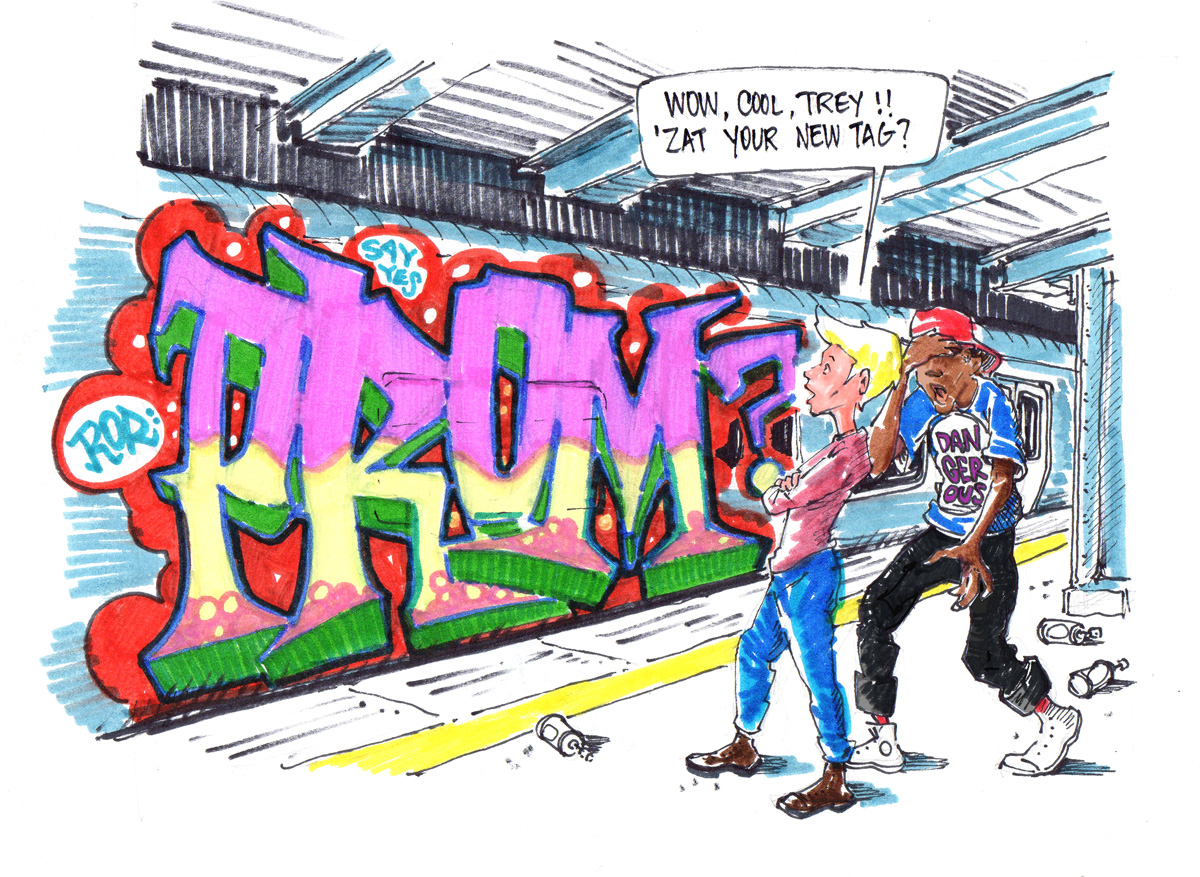 Meet Trey and Ror, the stars of our upcoming graphic novel INTO THE DANGEROUS WORLD. Ror has the talent to be an art superstar. She meets up with Trey, the seductive leader of Noise Ink, a graffiti crew. They go to Cady High in bombed-out 1984 Manhattan, but they're really studying at the best art school the underground has to offer: The Street Art Academy. The question is: Are they ready for each other? And is the world ready for them?