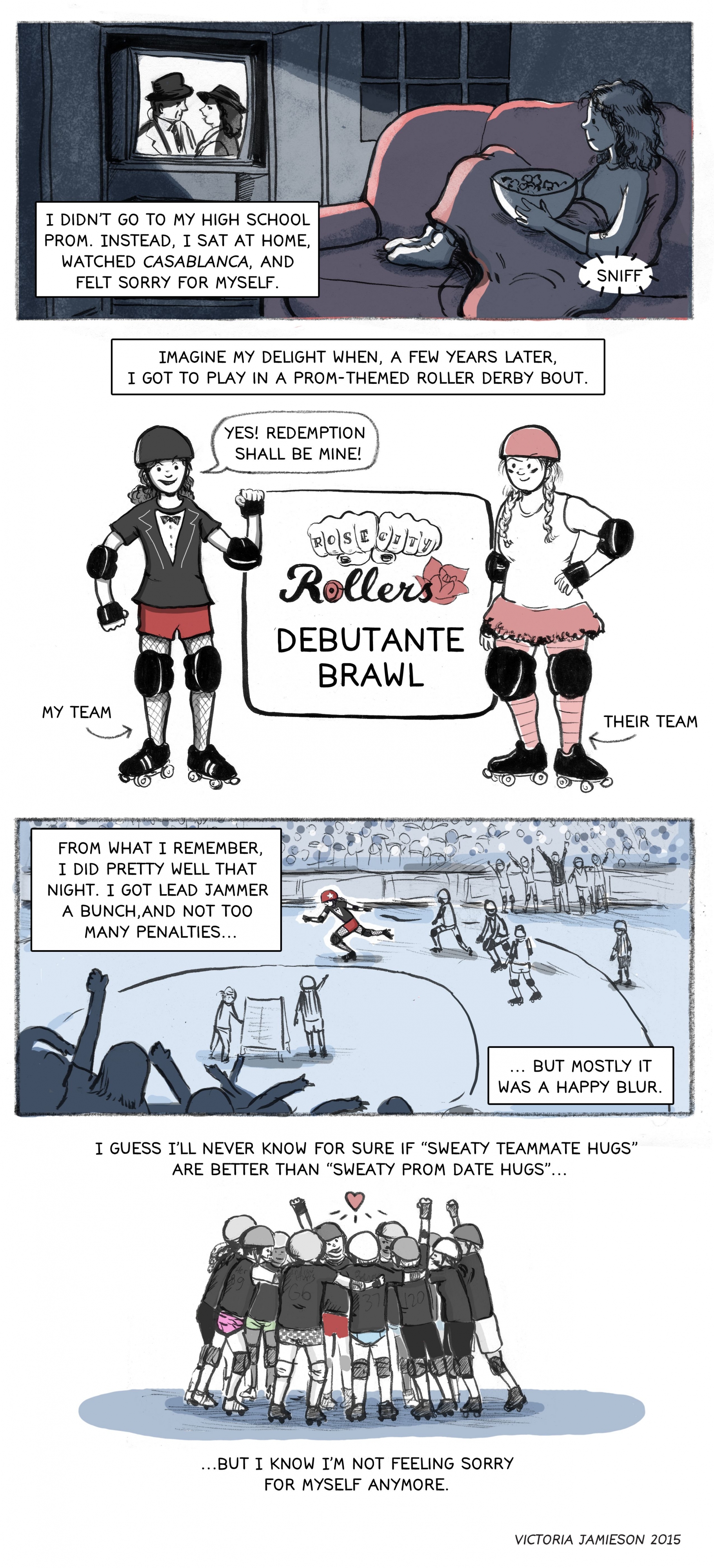 Sometimes roller skates and teammates make for way better proms than gowns and streamers --- ROLLER GIRL author/illustrator Victoria Jamieson will prove it to you in her sweet and kickbutt comic, below!