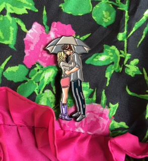 Overall, my experience at the Books of Wonder bookstore was an utter success. Maybe it was because Siobhan Vivian went out of her way to make this book signing a pleasant experience for everyone involved --- or maybe it was because her reading was beyond moving and heartfelt, or maybe it was because the sheer sense of gratitude for such an amazing text, THE LAST BOY AND GIRL IN THE WORLD was overwhelmingly palpable. Either way, I cannot wait for Vivian’s next book! At the end of the evening, I had the pleasure of meeting Vivian for a second time --- a more formal introduction in which she out did herself yet again when she told me the bowl of adorable pins on the table were for us to take as souvenirs! The pin features a cut out of a boy and girl kissing under an umbrella and was designed by Vivian's husband. I can't think of a more perfect way to end the evening!