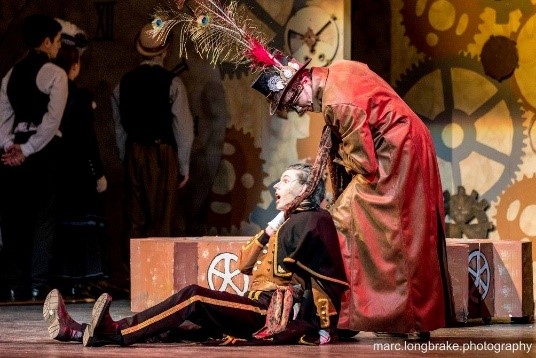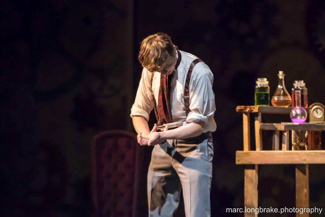 Jekyll and Emma’s (his fiancé) engagement party. Note the open platform! I used to be one of the people to move it on and off stage, but on opening night, the top piece (weighing over 100 pounds) fell on my head and arm. I had a nice dent in my head (yay concussions!) and some beautiful bruises! I was moved to other side of the stage.