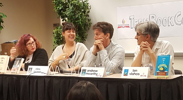 As a side note here, I just want to mention something I learned about panels throughout the rest of the day --- what makes one GREAT is not the noterity of authors on it, but instead the chemistry they have together as they jive and banter their way through the questions asked of them. This first panel remains my favorite to this day: Kathleen Glasgow (GIRL IN PIECES), Nina LaCour (WE ARE OKAY), Andrew McCarthy (JUST FLY AWAY author as well as "Pretty in Pink" actor), and Len Vlahos (LIFE IN A FISHBOWL) seemed like they’d known each other their entire lives, teasing each other incessantly and fangirling over each other’s books. What made this panel truly stand out, however, was the particularly poignant questions posed by the attendees. By some odd act of fate, I had ended up in a room of future novelists who had very interesting questions about the writing process.