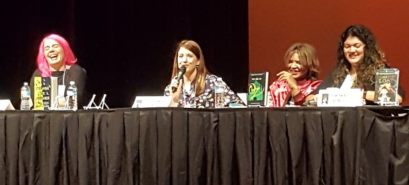 There was only one word to describe this moment: Thrilling. This is what I’d come for. The lack of decorum and pretention, the sheer, unadulterated excitement that we tend to stifle as we age. For a minute, I was a teen again. Thankfully, teenage me was a huge gamer and was thus aptly prepared for quickly figuring out the map of where the panels were being held. I threw myself into the crowd and was soon seated in my first panel of the day. As I tried to quiet my huffing and puffing and cursed myself for being old and not going to the gym more often, the authors slowly trickled in.