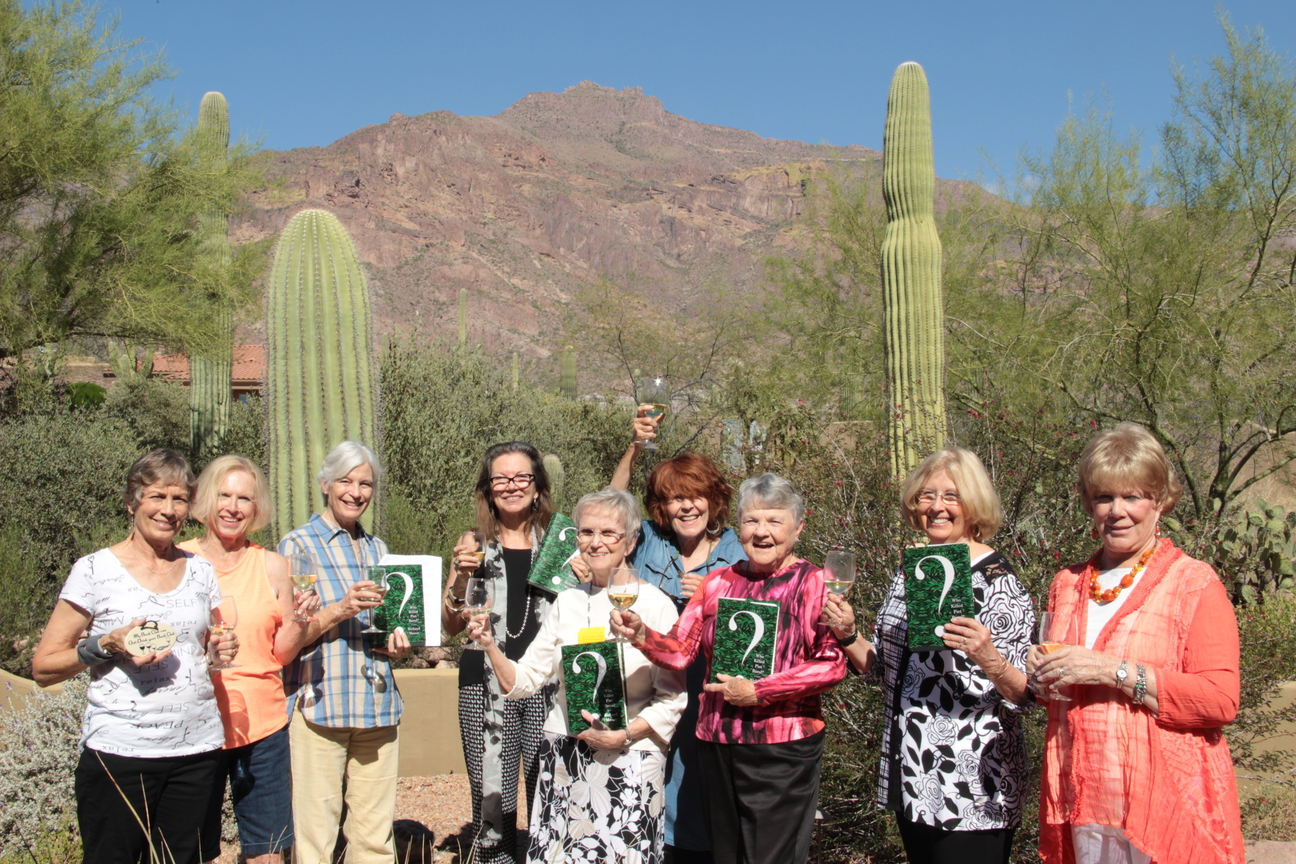 Pictured above (from left to right): Lauren Mitchell, Carole Lindemann, Louise Schimmel, Jo Anne Lowney, Roz Shea, Anne Coe, Trish Mosier, Linda Norton (their hostess) and Mary Dougherty of The Gold Canyon Best Book Club are lifting their glasses of South African Pinot Grigio to author Richard Mason.